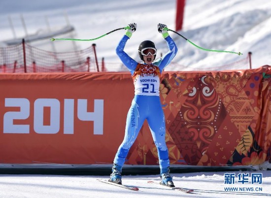 2月12日,梅兹庆祝胜利。当日,在2014索契冬奥会高山滑雪女子滑降比赛中,斯洛文尼亚选手梅兹以1分41秒57的成绩夺冠。 新华社记者李钢摄